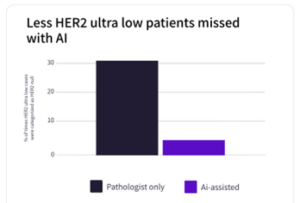 Evidence supporting this approach is rapidly accumulating. At ASCO last year, Mindpeak presented results from an international study conducted in collaboration with AstraZeneca focusing on HER2-ultralow breast cancer[5]. The study included 1,940 HER2 IHC cases reviewed by 105 expert pathologists across ten countries, reflecting real-world trial conditions. AI support acted as a safety net for biomarker assessment, reducing misclassification of HER2-ultralow samples incorrectly scored as null from 30.5% to 4.5%.